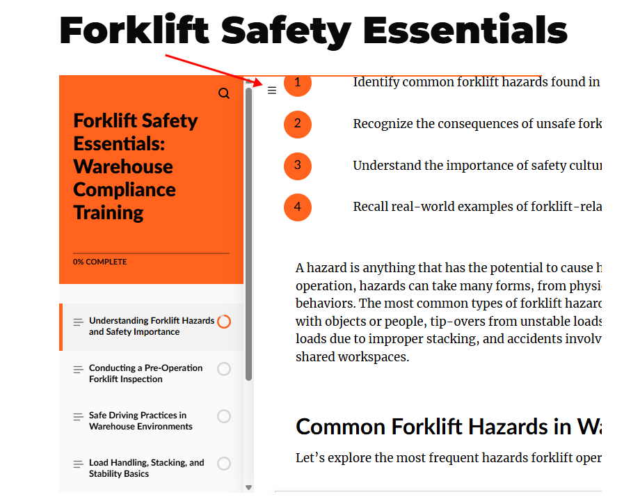 - A sidebar menu can be opened or closed by the learner