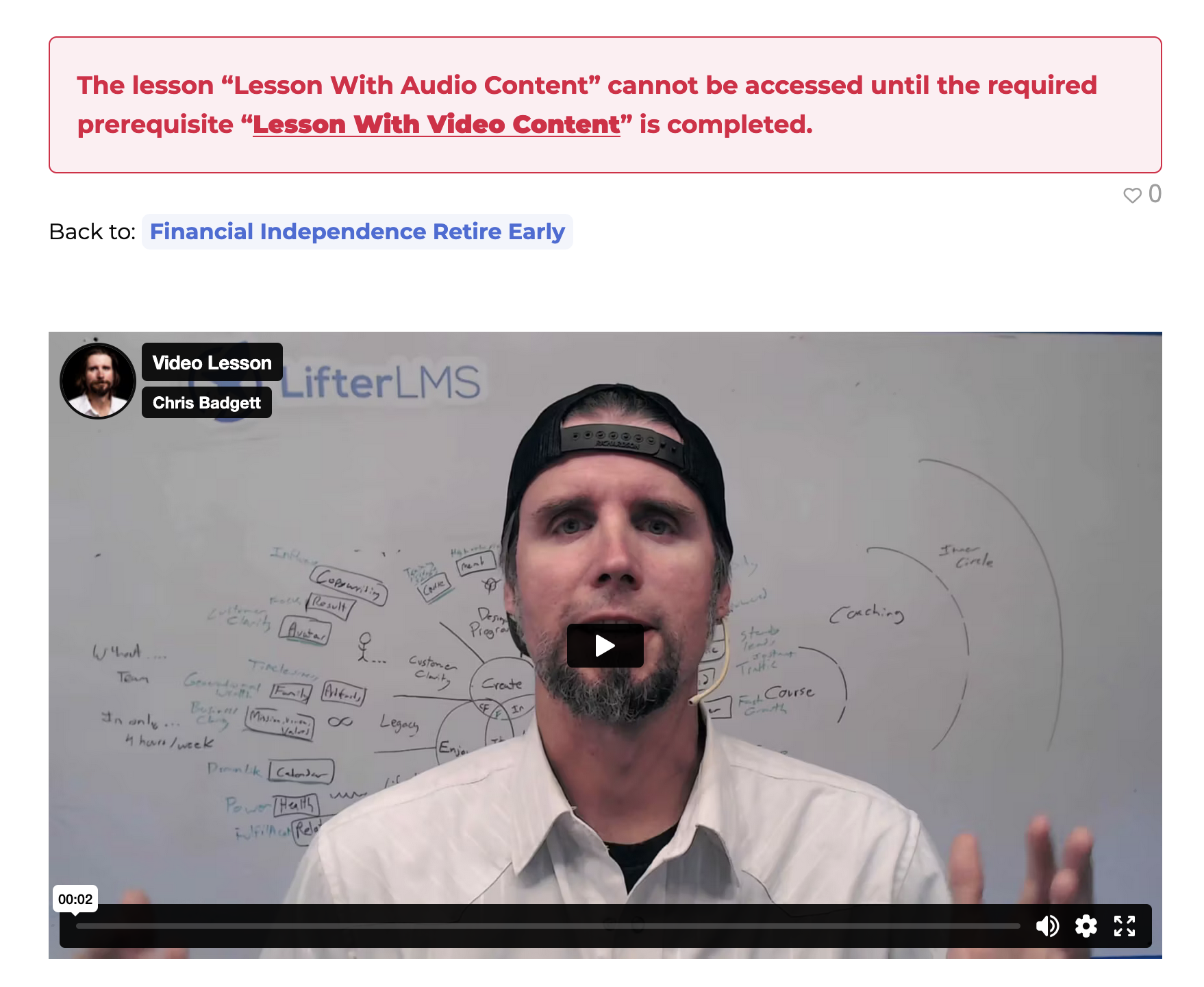 Once you have enabled the prerequisite functionality, users will see an error message if they try to access the next lesson before completing the prerequisite lesson.