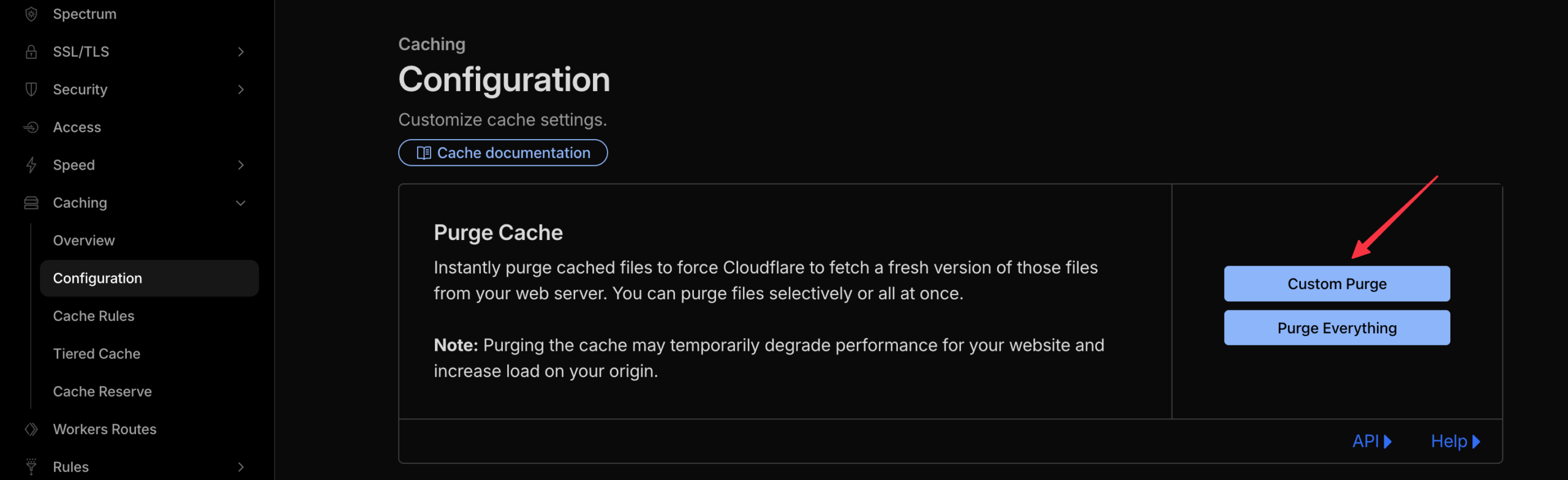- Log in to Cloudflare and navigate to Caching > Configuration.