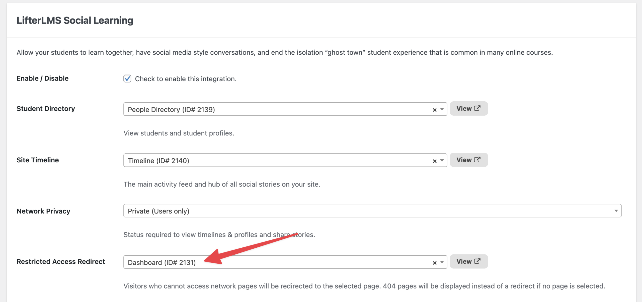 1. Locate the “Restricted Access Redirect” setting if you selected a private option.