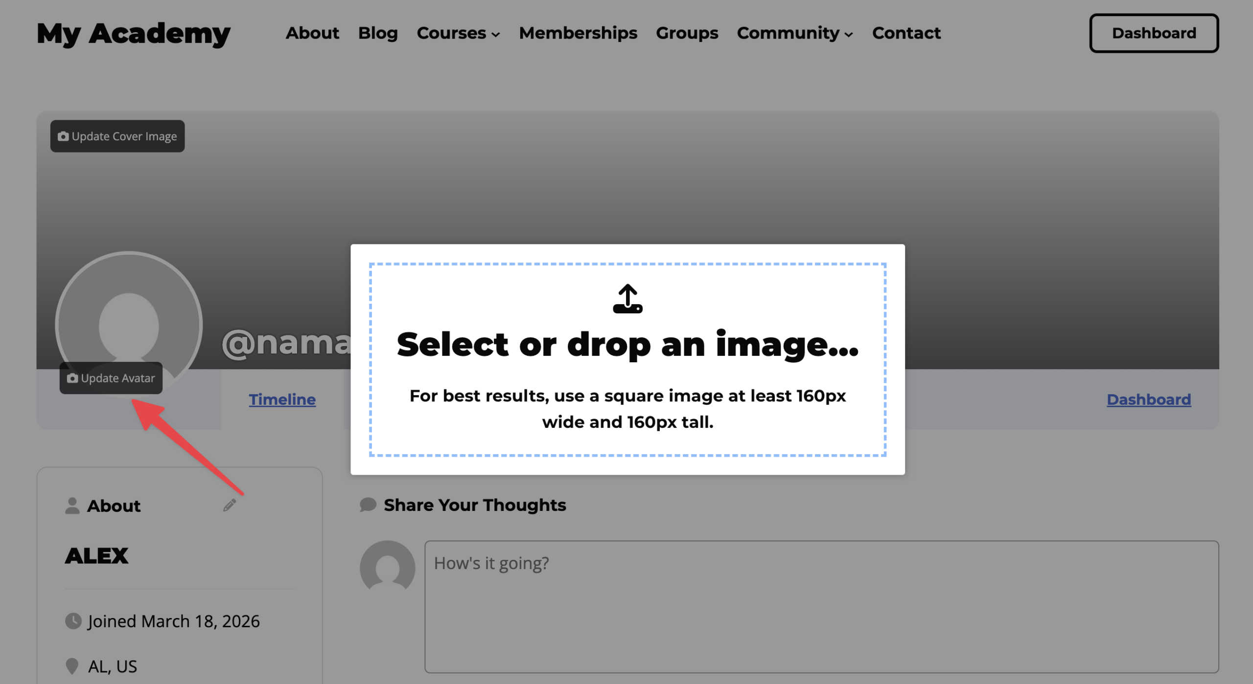 2. Click the “Update Avatar” text or camera icon over your profile picture to upload a new photo of yourself.