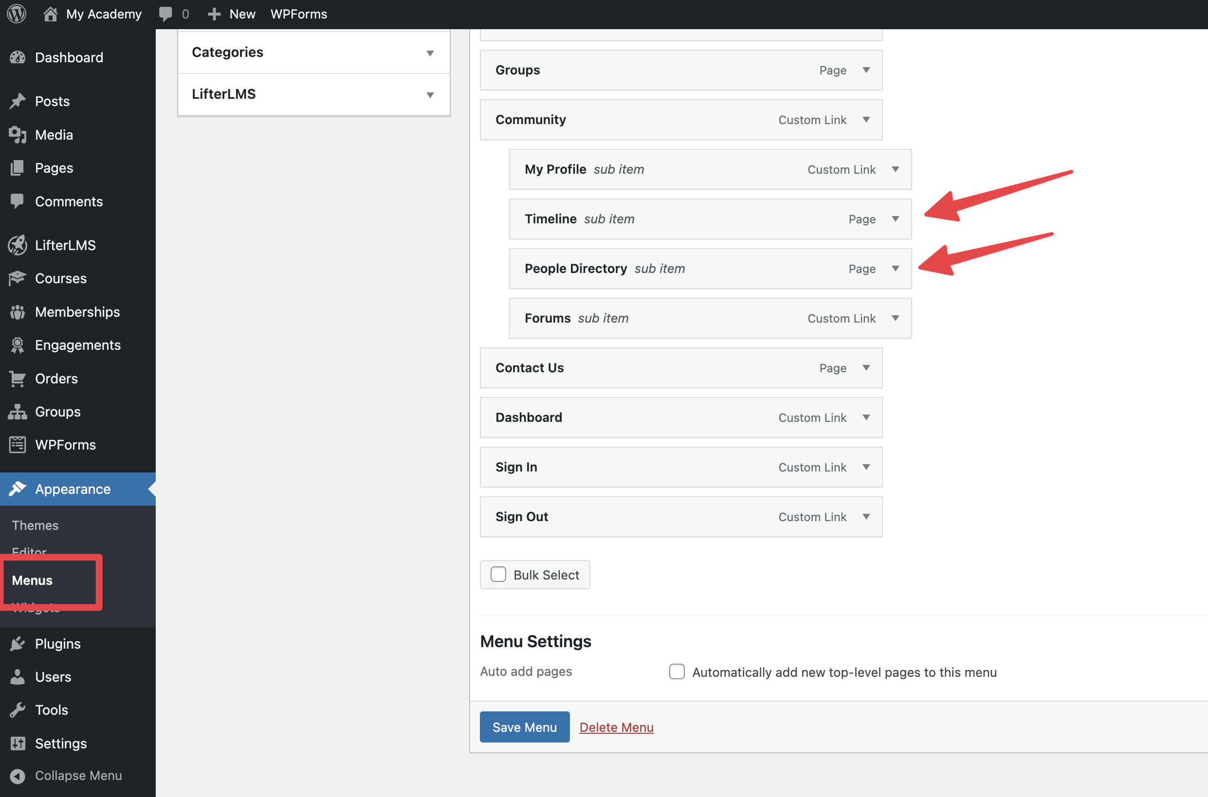 1. Expand the “LifterLMS” panel on the left side to add a dynamic profile link.