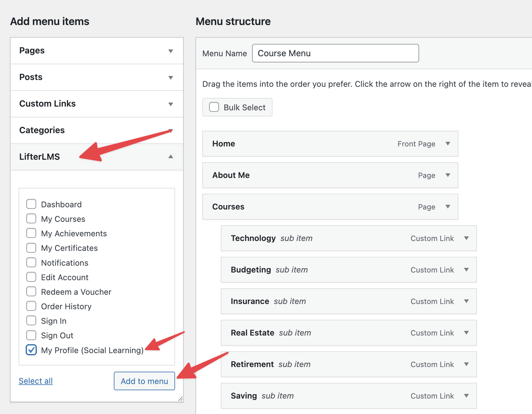 2. Check the box next to “My Profile”. This creates a link that automatically takes the logged-in student to their own personal profile. This link remains completely hidden from logged-out visitors. Please note that the URL for this item is #llms-sl-profile, and you must leave it exactly as it is.