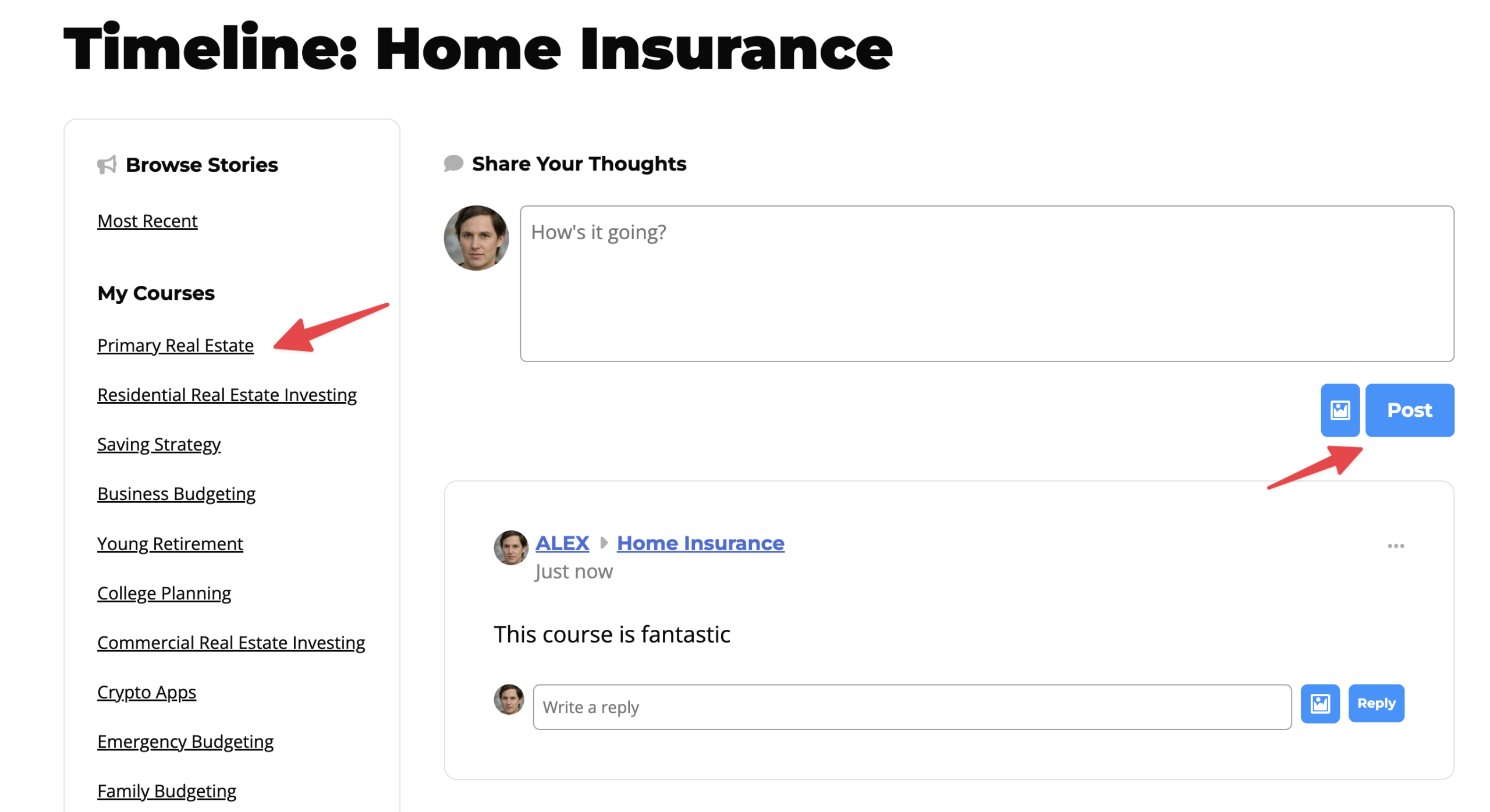 Alternatively, you can share your thoughts with a focused community by posting directly on the timeline of a specific course or membership. Just like most popular social media platforms, you can actively participate in ongoing conversations by typing a response in the “Write a reply” box under other people’s posts.