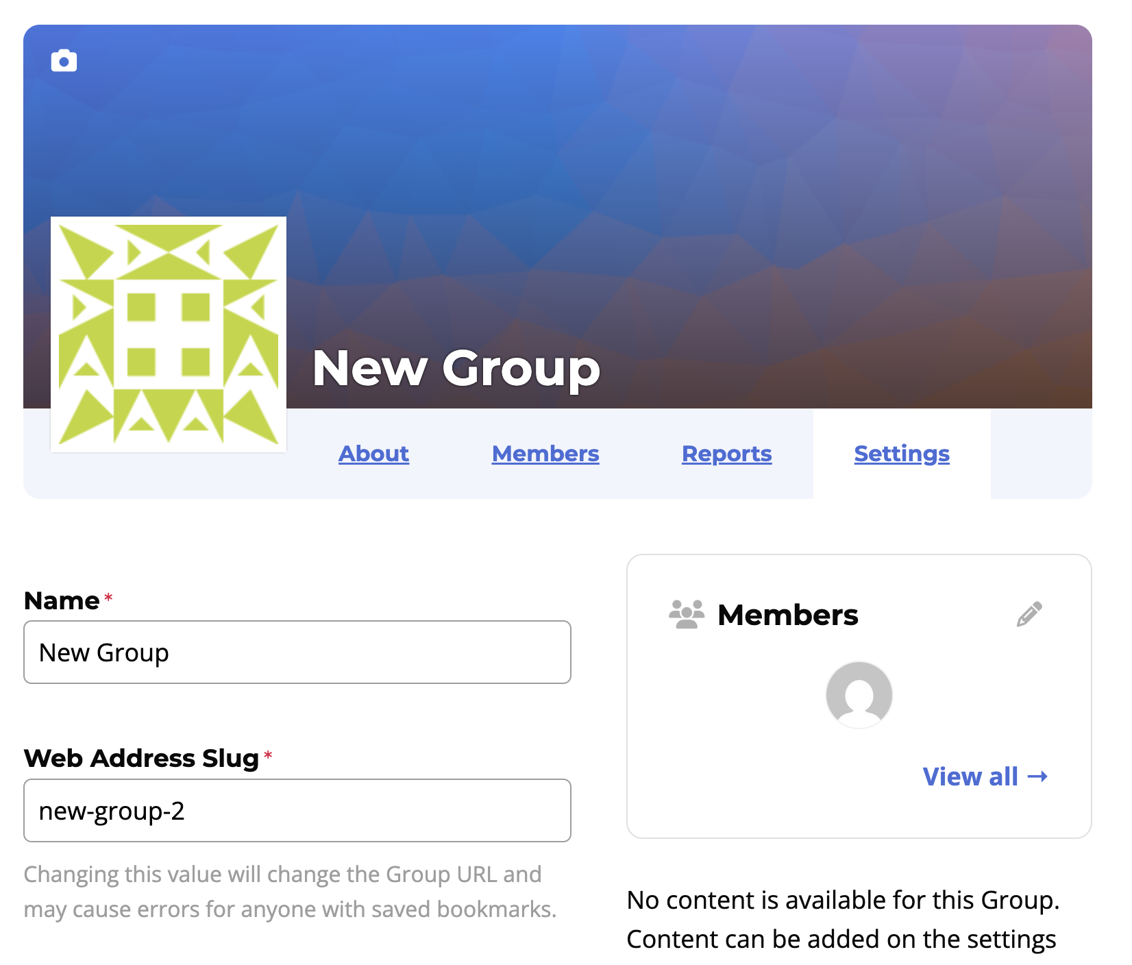 - Click on the “Settings” tab to update the group name or banner image.