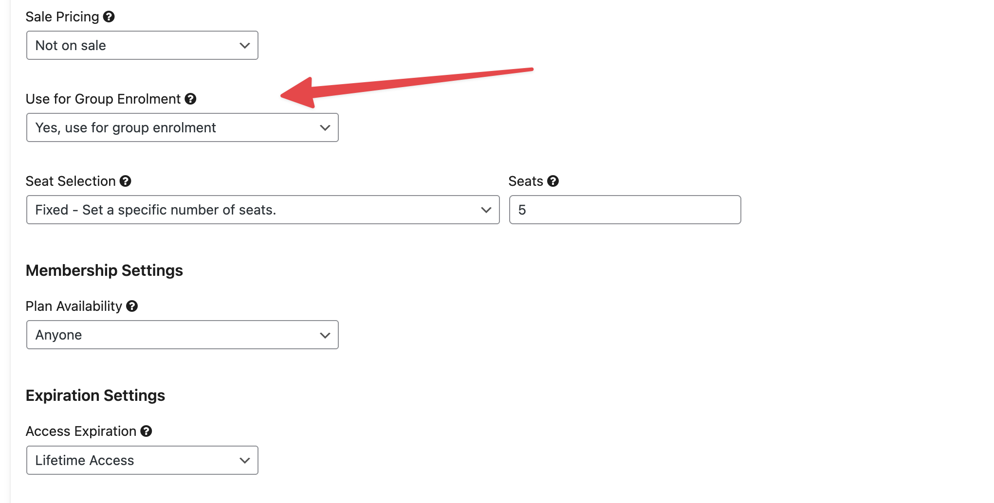 Note: The “Use for Group Enrollment” option will not be visible if the LifterLMS WooCommerce Integration add-on is active. To enable group enrollment and sell course or membership seats, you must first deactivate the LifterLMS WooCommerce Integration plugin.