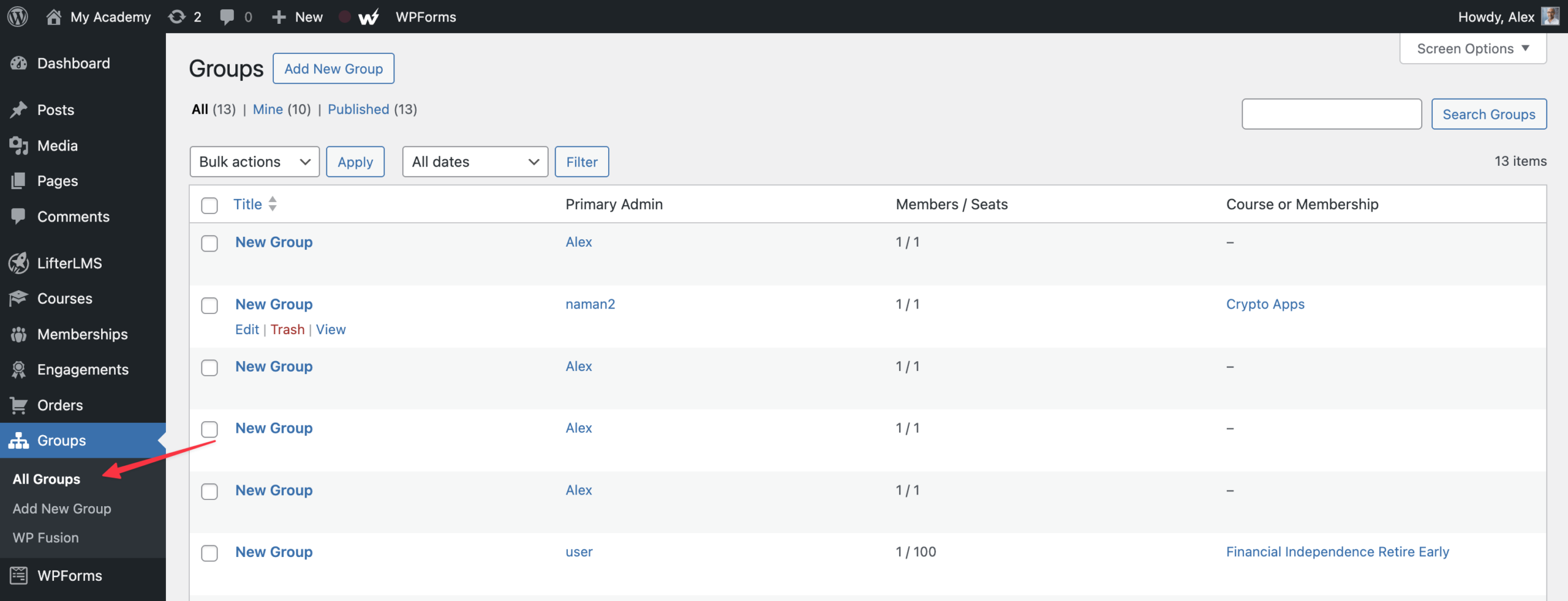 - Navigate to Groups > All Groups in your WordPress dashboard.