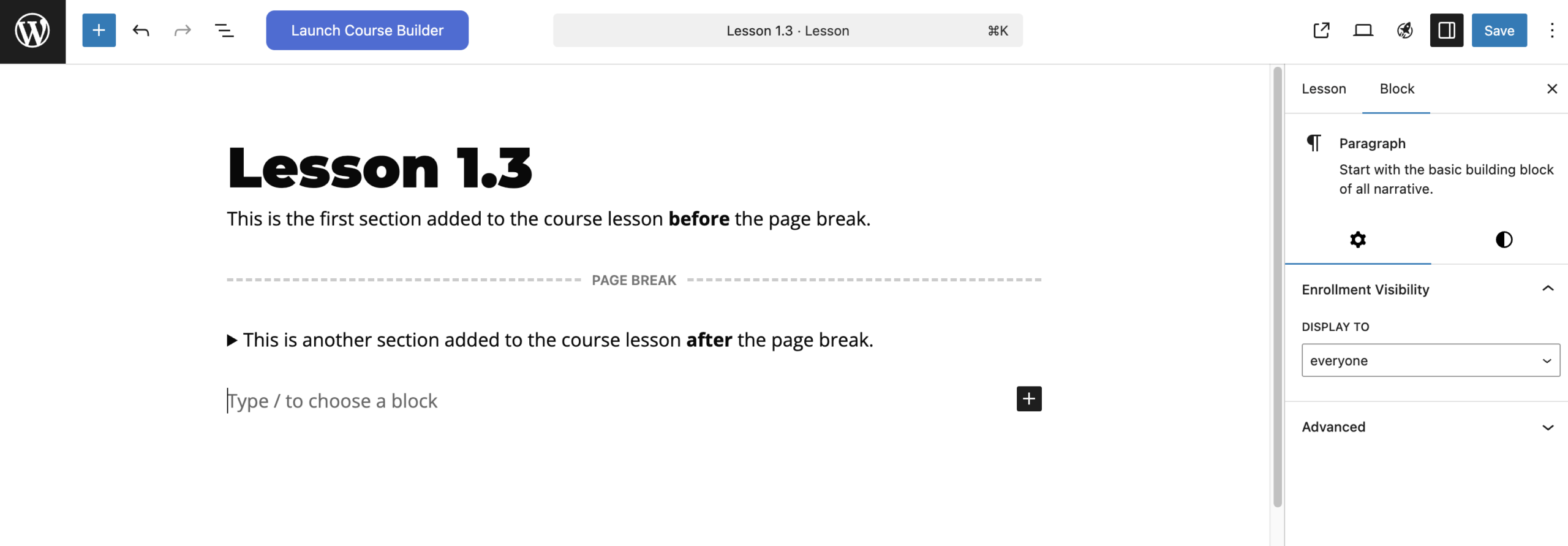 If you want to keep a large amount of content within one single lesson but break it up into smaller, manageable sections, you can use the WordPress block editor.
