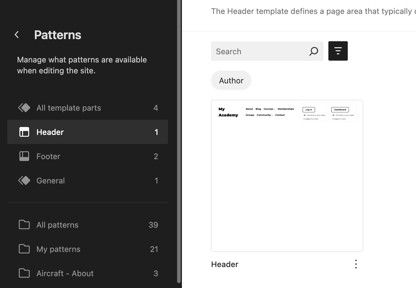 - On the Patterns screen, select Header. This opens your available header patterns. Choose the one you want to edit.