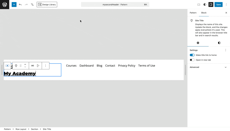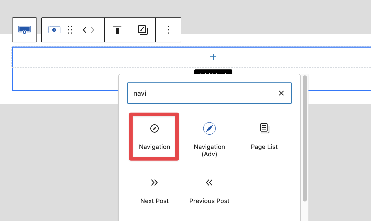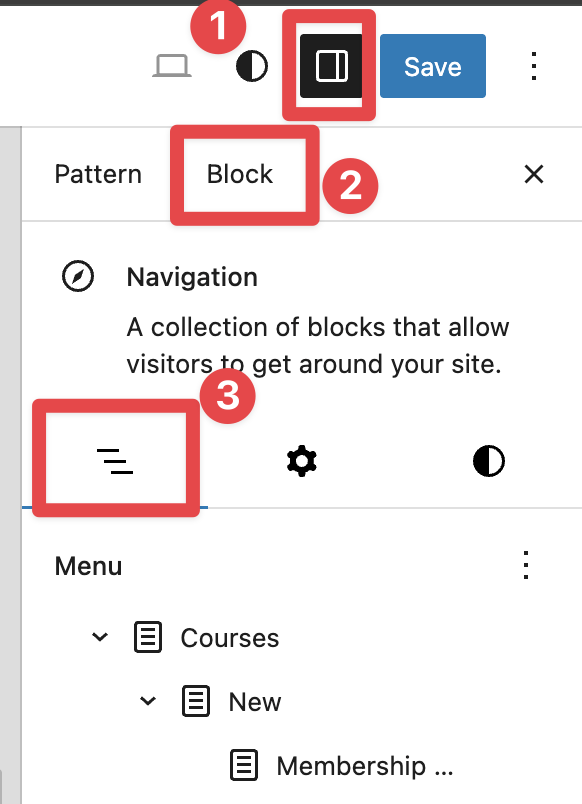 - Select the Navigation block in the header. If your header does not include one yet, add a Navigation block first.