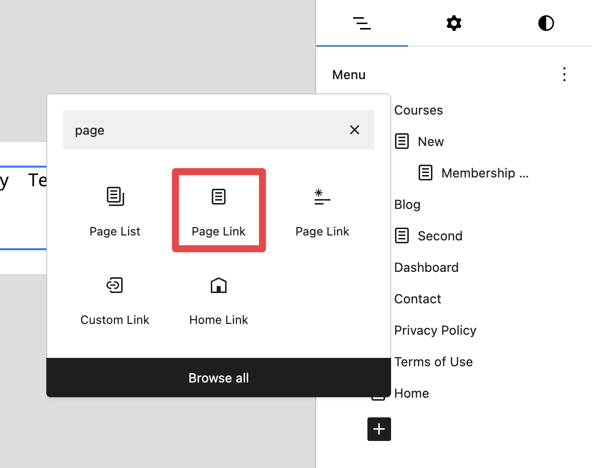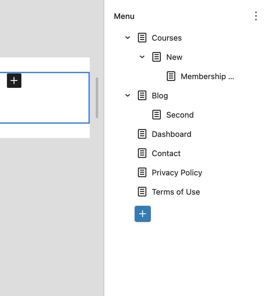 - To add a new link, click the plus icon and select Page Link. Then drag it into place, including nesting it under a parent item if needed.