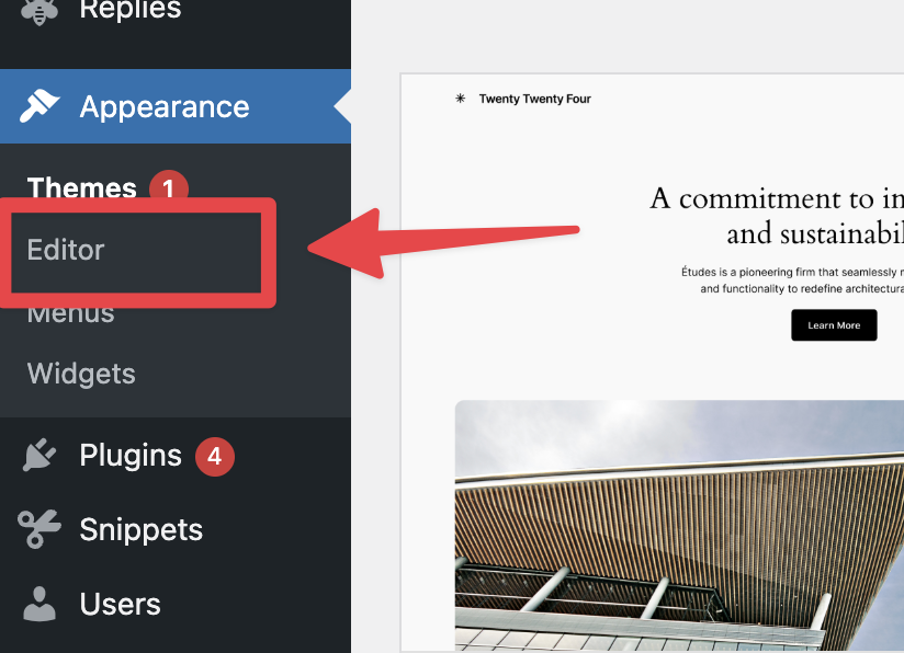 - Navigate to Appearance > Editor in the left menu.