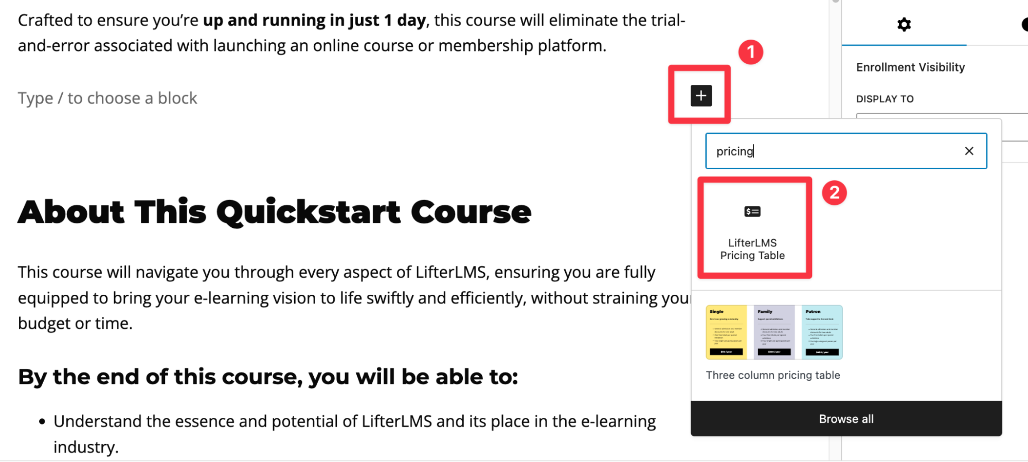 While editing a course or membership in the WordPress block editor, add the “LifterLMS Pricing Table” block to the page. You can follow this YouTube tutorial for a step-by-step guide on how to add the block: