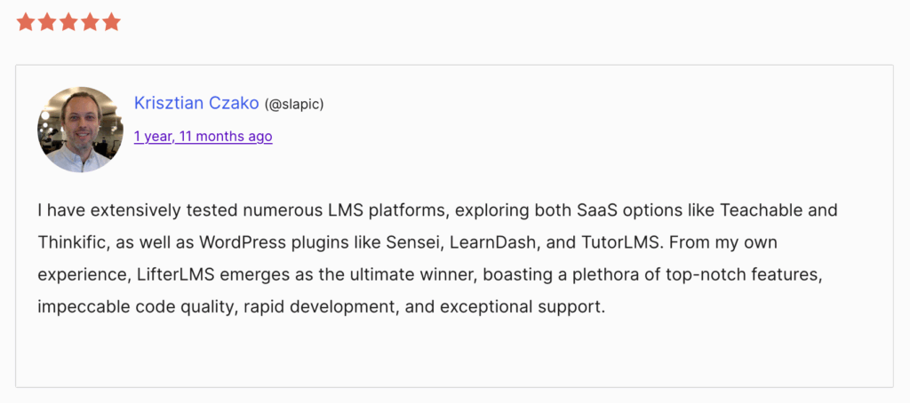 LifterLMS brings courses, memberships, payments, certificates, assignments, reporting, and student dashboards together in one system. It simplifies the setup and avoids the plugin chain that often creates issues for Sensei users.